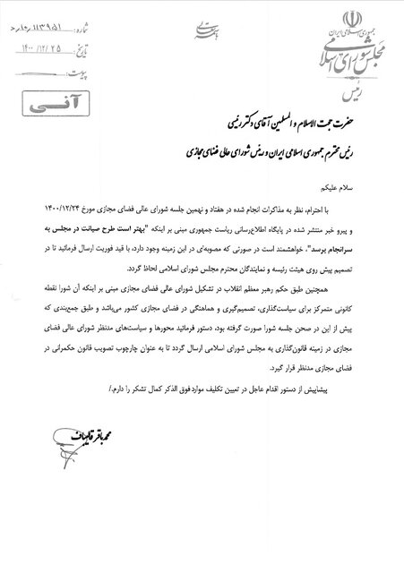 با احترام، نظر به مذاکرات انجام شده در هفتاد و نهمین جلسه شورای عالی فضای مجازی مورخ ۱۴۰۰.۱۲.۲۴ و پیرو خبر منتشر شده در پایگاه اطلاعرسانی ریاست جمهوری مبنی بر اینکه «بهتر است طرح صیانت در مجلس به سرانجام برسد»، خواهشمند است در صورتی که مصوبهای در این زمینه وجود دارد، با قید فوریت ارسال فرمایید تا در تصمیم پیش روی هیات رئیسه و نمایندگان محترم مجلس شورای اسلامی لحاظ گردد.