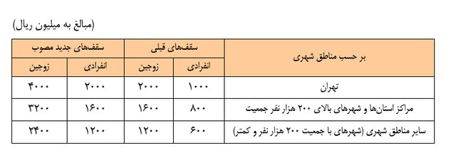 سقف تسهیلات خرید، ساخت، جعاله و ودیعه مسکن از محل اوراق گواهی حق تقدم تسهیلات مسکن، به شرح ذیل افزایش یابد: